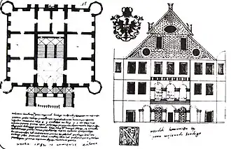 Судя по фрагменту гравюры, замок имел четырёхугольную форму с четырьмя трёхъярусными башнями по углам и въездными воротами с северо-западной стороны[13]. На гравюре хорошо заметны два уровня бойниц над замковыми стенами, части башен.
