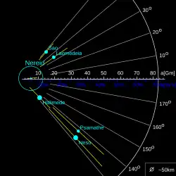 Несо обращается вокруг Нептуна за 26,67 года. Спутник движется по сильно наклоненной и сильно эксцентричной орбите, показанной на картинке слева, по отношению к другим нерегулярным спутникам Нептуна[3].