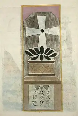 В китайской традиции, верхняя часть стелы увенчана двумя переплетающимися драконами; но присмотревшись, там можно обнаружить и крест.
