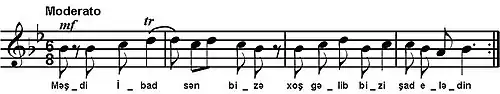 - ↑ Агаев А. М. О некоторых аспектах социально-экономического развития Исламской республики Иран. — Известия Академии наук Азербайджанской ССР. — Издательство Академии Наук АзССР, 1986. — С. 39.Оригинальный текст (рус.)Одним из самых любимых и почитаемых тебризцами композиторов являлся основоположник азербайджанского оперного искусства У. Гаджибеков. В различные годы в Тебризе были поставлены его оперы «Лейли и Меджнун», «Асли и Керем», «Шах Аббас и Хуршид Бану», музыкальные комедии «Не та, так эта» и «Аршин мал алан», оказавшие огромное влияние на развитие национального театра в странах Востока, в частности на становление иранского театра.