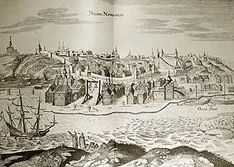 При Иване III Нижний Новгород играет роль пограничного города, имея постоянное войско, и служит местом военного сбора при действиях Москвы против Казани. В целях усиления обороны города вновь были начаты работы над устройством крепостных стен. Началом строительства каменного Нижегородского кремля стала закладка в 1500 году 1 сентября в верхней части города Тверской (ныне Кладовая) башни. Работа была прервана набегом орды хана Мухаммед-Амина в 1505 году. Возобновлено строительство было в 1508 году. При этом сохранявшийся старый дубовый кремль был уничтожен в сильном пожаре 1513 года. Завершено строительство, как предполагают, где-то после 1516 года. Основные работы по сооружению кремля осуществлялись под руководством присланного из Москвы архитектора Пьетро Франческо (Петра Фрязина)[5]. В XVI веке кремль многократно подвергался осадам и приступам со стороны казанских татар (в 1521 и 1536 годы)[6], при этом ни разу не был сдан осаждающему войску. К 1697 году кремль утратил военное значение.