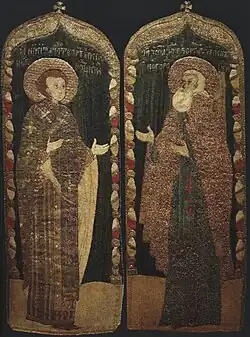 ![]() Фреска с изображением св. Никиты архиепископа Новгородского из Владычной (Грановитой) палаты, 1433 г. | ||