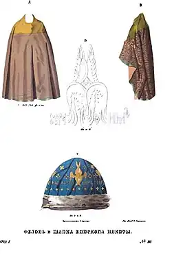 При открытии св. мощей его в 1550 г. найдено на нём облачение, сохранившееся нетленным в могиле, где оно лежало 450 лет. Все облачение состоит из фелони, епитрахили, поручей, палицы, штофных коричневого цвета, гарусного пояса, омофора из белого люстрина, из синей гродетуровой (из плотной тафты) шапочки, опушенной горностаевым мехом; на ней вышиты золотом кресты и серафимы со словами Сҍрафимъ. Такая шапочка служила митрой. К этой епископской утвари XI в. принадлежит архиерейский посох, о коем ниже будет сказано, и железные вериги весом в 20 ф., найденные на мощах Иерарха. В день открытия нетленных его останков принесена была новгородцами ко гробу его железная лампада, хранящаяся в ризнице, с круговой прорезной надписью: «Свҍча Великаго Новгорода всҍхъ православныхъ хрестьянъ, поставлена новому чудотворцу Никитҍ вҍ лҍто /--зk`s, Апрҍля въ л` день, при Архїепїскопе Пимене».