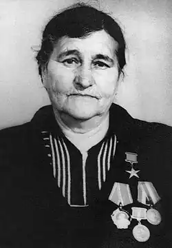 "За ваши исключительные заслуги перед государством, выразившиеся в получении в 1947 году урожая стебля южной конопли 65 центнера и семян южной конопли 7 центнера с гектара на площади 7 гектаров, Президиум Верховного Совета СССР своим Указом от 19 мая 1948 года присвоил Вам звание Героя Социалистического Труда с вручением ордена Ленина и золотой медали «Серп и Молот»
