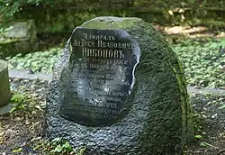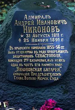 - Ещё больше отличился сын адмирала Никонова — Сергей Андреевич[34]. Студент математического факультета Петербургского университета, затем Медико-хирургической академии, он в 1885 году примкнул к народовольцам. Вместе с Александром Ульяновым участвовал в подготовке покушения на императора Александра III 1 марта 1887 года, но был арестован за месяц до этой даты. Он избежал смертной казни и был сослан. С 1902 года в составе Севастопольского комитета партии социалистов-революционеров. Трижды ссылался, 5 лет жил в эмиграции, где в Париже окончил медицинский факультет. Возвратился в Россию в 1917 году. Работал врачом-хирургом городской больницы в Севастополе, затем был комиссар Временного правительства А. Ф. Керенского, а с 1918 года — министр Крымского краевого правительства. В советское время неоднократно арестовывался, отказался публично отречься от своих убеждений. В 1925 году был выслан из Крыма, работал врачом в Сергиевом Посаде. В 1930 году вернулся в Севастополь, затем переехал в Ленинград. Член Общества политкаторжан и ссыльнопоселенцев, автор воспоминаний об Александре Ульянове. Умер в январе 1942 г. в блокадном Ленинграде. Похоронен на Серафимовском кладбище.