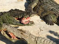 - ↑ Morpurgo, B., Gvaryahu, G., & Robinzon, B. (1993). Aggressive behaviour in immature captive Nile crocodiles, Crocodylus niloticus, in relation to feeding.Physiology & Behavior 53(6): 1157—1161.