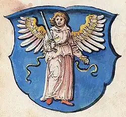 «В красном поле барочного щита Святой Архангел Михаил в воронёных доспехах с мечом и весами стоит на зелёной земле.».
