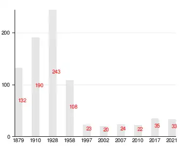 | 1879 | 1910 | 1928 | 1958 | 1997 | 2002 | 2007[14] |
