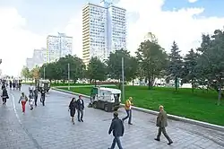 - № 22 — 25-этажный сдвоенный каркасно-панельный жилой дом-башня с предприятиями обслуживания (изначально магазин грампластинок «Мелодия», ныне «Кофехауз», ресторан «Пекинская утка» и др.). В доме жил актёр, народный артист РФ Г. Л. Бортников[32]; В доме были квартиры драматурга Алексея Арбузова и трагически погибшего (выпал из окна) литератора Леона Тоома.[3]