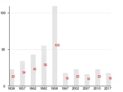 | 1838 | 1862[19] | 1958 | 1997 | 2007[20] | 2010[21] | 2017[1] |