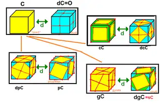Куб может образовать все выпуклые однородные многогранники с октаэдральной симметрией. В первой строке показаны архимедовы тела, а во второй — каталановы тела. Вторая строка образуется как двойственные многогранники к многогранникам первой строки. Если сравнивать каждый новый многогранник с кубом, можно понять визуально проведённые операции.