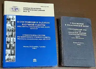 Стенограмма Сессии расширенного Учёного Совета Института геологических наук АН СССР 1948 года[3] была опубликована по архивным материалам только в начале 2022 года, издание приурочено к 90-летнему юбилею создания Геологического института РАН.
