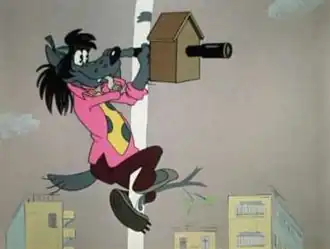 В городе Волк выслеживает Зайца через подзорную трубу, просунутую сквозь скворечник.