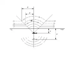 Зависимость радиуса обнаружения от глубины погружения ПЛ. Самолет обнаруживает лодку у поверхности (прерывистые линии), но не обнаруживает лодку на глубине (при h < h' , имеем R > R' )