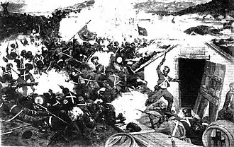 Оказавшееся между двух огней черкесское пешее ополчение «отчаянно, с потрясающим душу гиком» вновь бросилось на штурм и, несмотря на сильный огонь обороняющихся, сумело взобраться на вал одновременно в нескольких местах[54]. По сообщению Г. И. Филипсона, изначально часть горцев атаковала ту часть укрепления, где находился крытый и единственный выход гарнизона к воде. Но это оказалась «фальшивая» атака, целью которой было отвлечь гарнизон от северной и северо-восточной части укрепления, на которую следом устремились основные силы горцев[56].