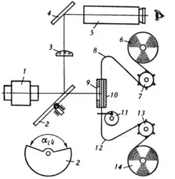 Схема кинокамеры с зеркальным обтюратором: 1 — объектив; 2 — зеркальный обтюратор; 3 — плоско-выпуклая коллективная линза с матированной поверхностью; 4 — оборачивающее зеркало; 5 — лупа; 6 и 14 — рулоны киноплёнки; 7 и 13 — зубчатые барабаны; 9 — кадровое окно; 10 — фильмовый канал; 11 — грейфер