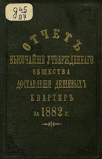 - ↑ Отчёт о деятельности Общества доставления дешёвых квартир и других пособий нуждающимся жителям Санкт-Петербурга за 1902 год. — Санкт-Петербург, 1903. — С. 6.