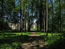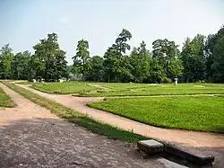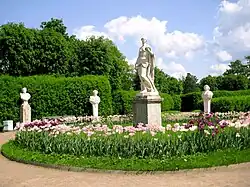 | Собственный сад | 1794—1797 годы | Один из трёх регулярных садов, в центре круглой площадки, образованной сходящимися аллеями, находится статуя Флоры. Сад украшен также десятью гермами, двумя мраморными вазами и мраморной головой Геры на балконе сада[2] | ![]() |