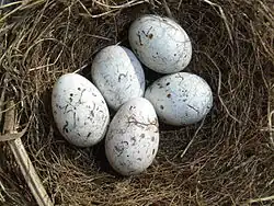 В сезон обычно 2 кладки, каждая из которых содержит 2—6 (обычно 4—5) яиц характерной «толстой» формы и светлого — голубовато-серого, светло-фиолетового, розоватого оттенка и причудливого ржавчато-бурого или тёмного рисунка в виде завитушек, запятых, крапинок и пятен. Размеры яиц: (19-23) х (15-18) мм[14]. Насиживает одна самка в течение 12—14 дней, начиная с предпоследнего или последнего яйца. В обязанности самца входит добыча корма. При приближении животного либо человека наседка покидает гнездо, взлетает на ветку близлежащего дерева и изредка подаёт тревожные сигналы — протяжный высокий свист или отрывистое циканье. Напуганная птица может и вовсе покинуть гнездо[7]. Если в гнезде уже появились птенцы, родители пытаются отвести хищника от гнезда — падают в траву у самого носа и затем отползают в сторону, изображая раненую птицу[15].
