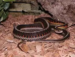 ![]() | Thamnophis sirtalis concinnus (Hallowell, 1852) | Обитает в США в штатах Орегон и Вашингтон. | Основной фон спины и боков чёрный, переходит на брюхо. Вдоль хребта проходит широкая бледная полоса. По бокам ряд крупных красных или красно-оранжевых пятен или поперечных полос, а также продольная полоса, которая иногда может отсутствовать. Голова сверху и по бокам красноватая или оранжевая. Некоторые особи в Нью-Мексико и на западе Вашингтона с белыми или синеватыми полосой на спине, пятнами по бокам и головой[10]. |