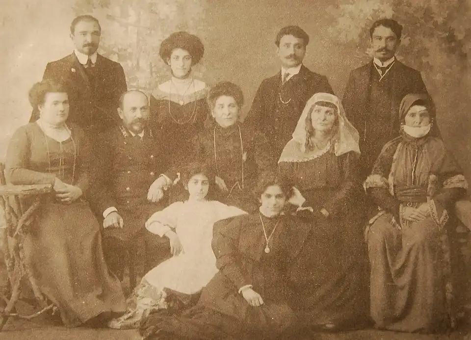 (в верхнем ряду, крайний слева — Л. А. Оганесян, крайняя слева сидит его жена — А. Б. Абазян-Оганесян, рядом сидят его родители — отец А. А. Оганесян и мать В. А. Асриева).