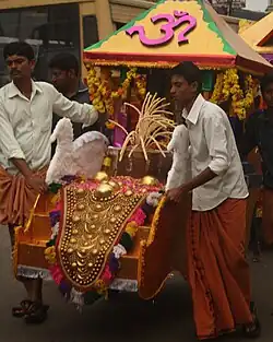 Дхоти — шестифутовое белое хлопковое полотно. Это традиционное одеяние, главным образом, носят мужчины в деревнях[32]. Дхоти держится благодаря поясу, охватывающий талию, который может быть как с орнаментами и узорами, так и простым[33].