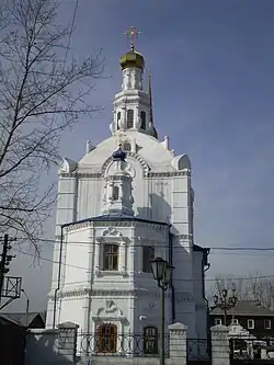 Среди них центральное место занимает двухэтажный бесстолпный массивный объём четверика с пятигранной апсидой. Четверик перекрыт сомкнутым сводом, увенчан высоким куполом без кровли и световым двухъярусным фонариком. «Круглые» фронтоны с четырёхлепестковыми люкарнами по осям четверика, фигурные кокошники на углах образуют завершение стен, создавая эффект округлённости углов и органично соединяясь с куполом.