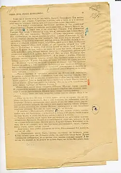 - ↑ אײן טאָג אין לעבן פֿון איװאַן דעניסאָװיטש (полный текст). Дата обращения: 14 сентября 2017. Архивировано 15 сентября 2017 года.