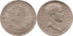 Чеканка серебряных монет в один франк начата в 1803 году (11 году республиканского календаря), в период консульства Наполеона. Рисунок монеты выполнил Пьер-Жозеф Тиолье. Год чеканки обозначен годом республиканского календаря, в 11-м году — римскими цифрами («XI»), в 12-м году — европеизированными арабскими («12»). На аверсе с портретом Наполеона надпись — «Бонапарт первый консул»[1].