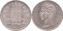 23 | 5 | Серебро 900 | 1825—1830 | Монетные дворы — Париж (A), Руан (B), Страсбург (BB)), Лион (D), Лимож (I), Ла-Рошель (H), Бордо (K), Байонна (L), Тулуза (M), Марсель (MA), Перпиньян (Q), Нант (T), Лилль (W). Тираж — 5 280 808 | |||