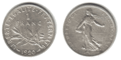 С 1866 года 835-я проба серебряной однофранковой монеты оставалась неизменной. С началом Первой мировой войны высокопробные золотые и серебряные монеты исчезли из обращения. Продолжая выполнять условия фактически распавшегося с началом войны Латинского монетного союза, Франция продолжала чеканить серебряные монеты. Несмотря на то, что монеты в один франк в 1914—1920 годах чеканились большими тиражами, чем до войны, в обращении эти монеты практически не участвовали, подвергаясь тезаврации. «Разменный голод» вызвал появление большого количества различных суррогатов. В 1920 году был начат выпуск монет в 1 франк из алюминиевой бронзы, которые чеканились до 1927 года. Официально выпущенные как боны Коммерческой палаты Франции, фактически они обращались как общегосударственные монеты, а так как формально они не были выпущены в обращение государством, они могли не соответствовать требованиям Латинского монетного союза. Рисунок этих монет выполнил Жозеф-Франсуа Домар[8].