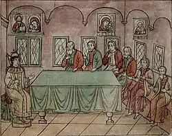"И велел государь боярину Ивану Никитичю и тысячкому князь Ивану Борисовичю и друшкам и бояром сести в Большой лавке, а поезжаном в другой"