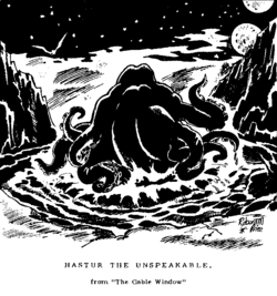 Фред решает провести ритуал, описанный его братом. Он обводит мелом каменную звезду, чертит каббалистические знаки, встаёт в их центр и произносит слова: «Пнглуи мглунаф Ктулху Рлайх угахнагл фтагн». Внезапно в стекле возникает залитый солнцем ландшафт с выжженной почвой: всюду холмы песчаника и пустынная растительность; несколько крупных пещер на переднем плане и цепь заснеженных гор на горизонте. В скале видна пещера, из которой появляться невообразимый монстр: