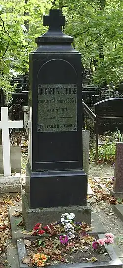 Скончался в Ялте 14 ноября 1883 года в возрасте 45 лет от порока сердца. Тело было переправлено в Москву и предано земле на Введенском кладбище[15]. В 2008 году могила Оливье была обнаружена и восстановлена (12 уч.)[16].