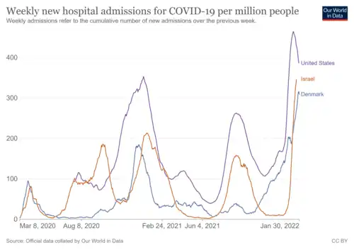 Быстрое распространение омикрон-штамма[2] и увеличение числа заболевших[31] ведёт к росту нагрузки на систему здравоохранения[2] и риску её перегрузки[19], а снижение доли тяжёлых форм на фоне растущего числа заражённых фактически приводит к тому, что абсолютное число тяжёлых больных не снижается или даже растёт[32]. Так, в ряде стран, например, США, Израиле и Дании, волна заражений омикроном уже вызвала рекордное число госпитализаций.