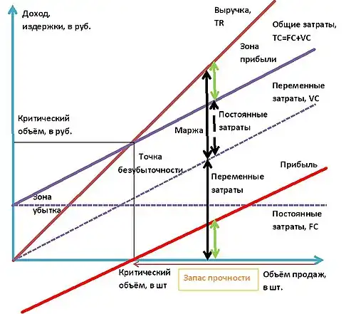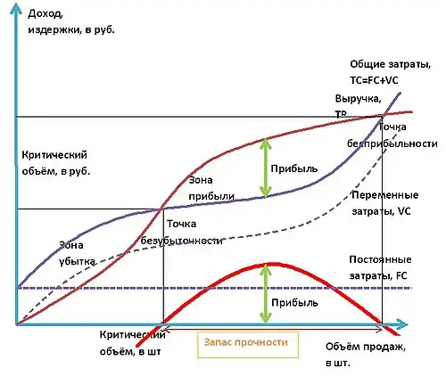 - Запас прочности = Расчётный объём продаж — Объём продаж в точке безубыточности.