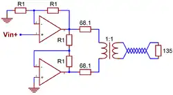 Бо́льшую гибкость и повторяемость обеспечивает схема на двух ОУ ТОС, часто применяемая как входной балансный усилитель в системах проводной связи[76]. В этой схеме сопротивления обратной связи и выбираются по документации производителя[76]. Сопротивление подбирается под желаемый коэффициент усиления, а минимальный устанавливается подбором сопротивления [76].