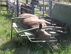 С 1970-х годов используются гидравлические наклоняемые столы для взрослого скота. они предназначены для подъёма и опрокидывания животного на бок для ветеринарной помощи, особенно при манипуляциях на гениталиях или копытах (в отличие от лошадей, коровы в стоячем положении обычно не позволяют кузнецу работать с копытом). Использовать такой стол намного безопаснее и проще, чем залезть под корову, причём лежащие на боку животные обычно быстро успокаиваются[22]. В описании подобного устройства, конструкции Западного колледже ветеринарной медицины в Саскатуне (Саскачеван), в качестве достоинства отмечался «комфорт для коровы»[23].
