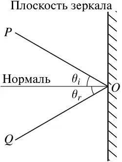 При зеркальном отражении направление отражённого луча определяется углом, под которым падающий луч образует нормаль к поверхности — линию, перпендикулярную поверхности в точке, где луч падает. Падающий и отражённый лучи и нормаль лежат в одной плоскости, а угол между отражённым лучом и нормалью к поверхности совпадает с углом между падающим лучом и нормалью[40]. Это наблюдение известно как закон отражения.