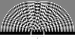 где — расстояние между двумя источниками волнового фронта (в случае экспериментов Юнга это были две щели), — угловое расстояние между центральной полосой и полосой -того порядка, где центральный максимум наблюдается при [53].