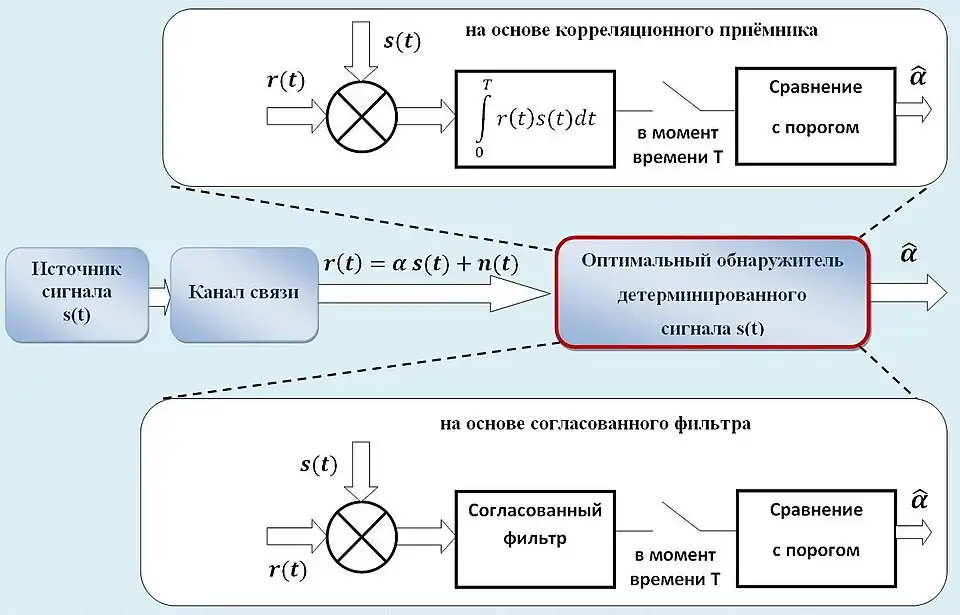 где E — энергия сигнала, а N — односторонняя спектральная плотность гауссовского аддитивного белого шума. Если , то принимаете гипотеза о наличии сигнала, иначе о его отсутствии на интервале наблюдения [].
