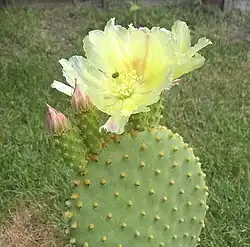 ![]() Два основных отличия этой разновидности — белоснежный цвет глохидий и меньший размер члеников (3—5 сантиметров в длину, 2—4 сантиметра в ширину), и, следовательно, меньший размер куста опунции. Старое растение достигает в высоту 30—50 сантиметров. Формирует новые членики чаще жёлтой разновидности. |