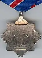 При помощи ушка и кольца знак ордена соединяется с пятиугольной колодкой, которая обтянута шёлковой, муаровой лентой синего цвета с красной полоской по центру между двумя белыми полосками. Ширина ленты составляет 24 миллиметра, ширина красной полоски — 5 миллиметров, а ширина белых полосок — 2 миллиметра[15].