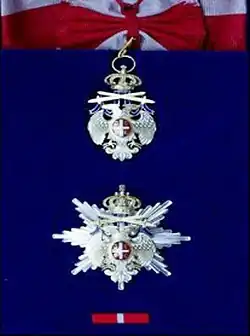Знак ордена — золотая плоская фигурка двуглавого орла белой эмали с прорисовкой золотом деталей голов, лап, перьев. На груди орла овальный медальон с красной эмали с прямым крестом белой эмали и изображениями золотых геральдических огнив по сторонам от него. За головами орла лента синей эмали, на которую наложены два перекрещенных золотых меча. Лента крепится к золотой королевской короне.