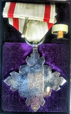 Знак ордена 1—5-го классов — серебряный позолоченный крест, каждое плечо которого составлено из трёх штралов, центральные из которых покрыты белой эмалью, а боковые — жёлтой. В центре расположен круглый медальон жёлтой эмали с широким ободком красной эмали. В углах креста — стилизованные изображения облаков светло-синей эмали; пространство между облаками и центральным медальоном заполнено чёрной эмалью. На оборотной стороне знака, гладкой без эмалей, изображены четыре иероглифа — «勲功位章»награда за заслуги»).