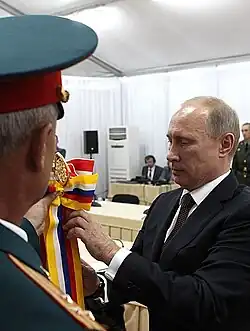 - лица высшего офицерского состава, а также старшие офицеры в должности командира дивизии (бригады) и выше Вооружённых Сил Российской Федерации за заслуги в разработке и успешном проведении ими крупных операций в период военных действий по защите Отечества.