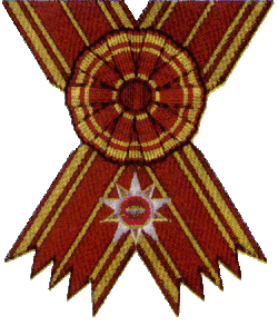 Лента ордена красного цвета с жёлтыми полосками, количество и толщина которых зависит от класса ордена.