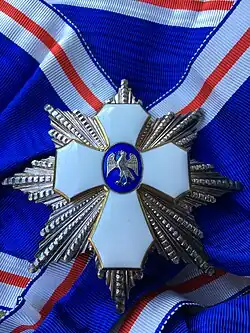 Звезда ордена восьмиконечная серебряная. На звезду кавалера Большого креста наложен орденский крест; звезда командора со звездой выглядит как звезда с круглым медальоном в центре, в который вписан овальный медальон синей эмали с белым (серебряным) соколом.