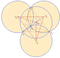 - Ортоцентрическая система. Здесь O1, O2, O3 и O4 — центры окружностей четырех возможных треугольников, образованных из ортоцентрических точек A1, A2, A3 и A4 (см. рис.). Три из них вершины исходного треугольника, а четвертая — его ортоцентр. Радиусы всех четырех окружностей равны. Центры трех из четырех окружностей (кроме описанной исходного треугольника) образуют вершины треугольника, равного исходному, со сторонами, попарно параллельными сторонам исходного треугольника.