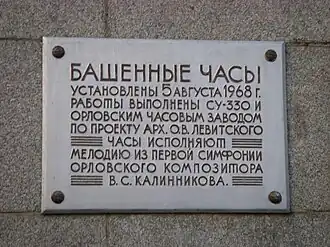 В день города, 5 августа 1968 г. в центре ансамбля внешнего здания вокзала были установлены башенные часы. Работы были выполнены СУ-330 и Орловским часовым заводом «Янтарь» по проекту архитектора О. В. Левитского. Часы исполняют мелодию из 1-й симфонии орловского композитора В. С. Калинникова.